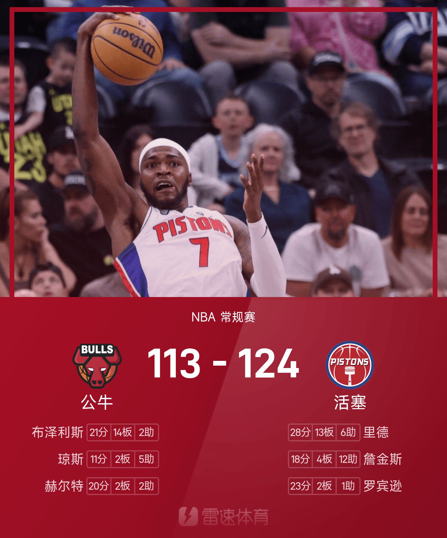 รายงานเกม NBA เรด 28 แต้ม 12 รีบาวด์ 6 แอสซิสต์ พิสตันส์ เอาชนะ บูลส์ 124-113