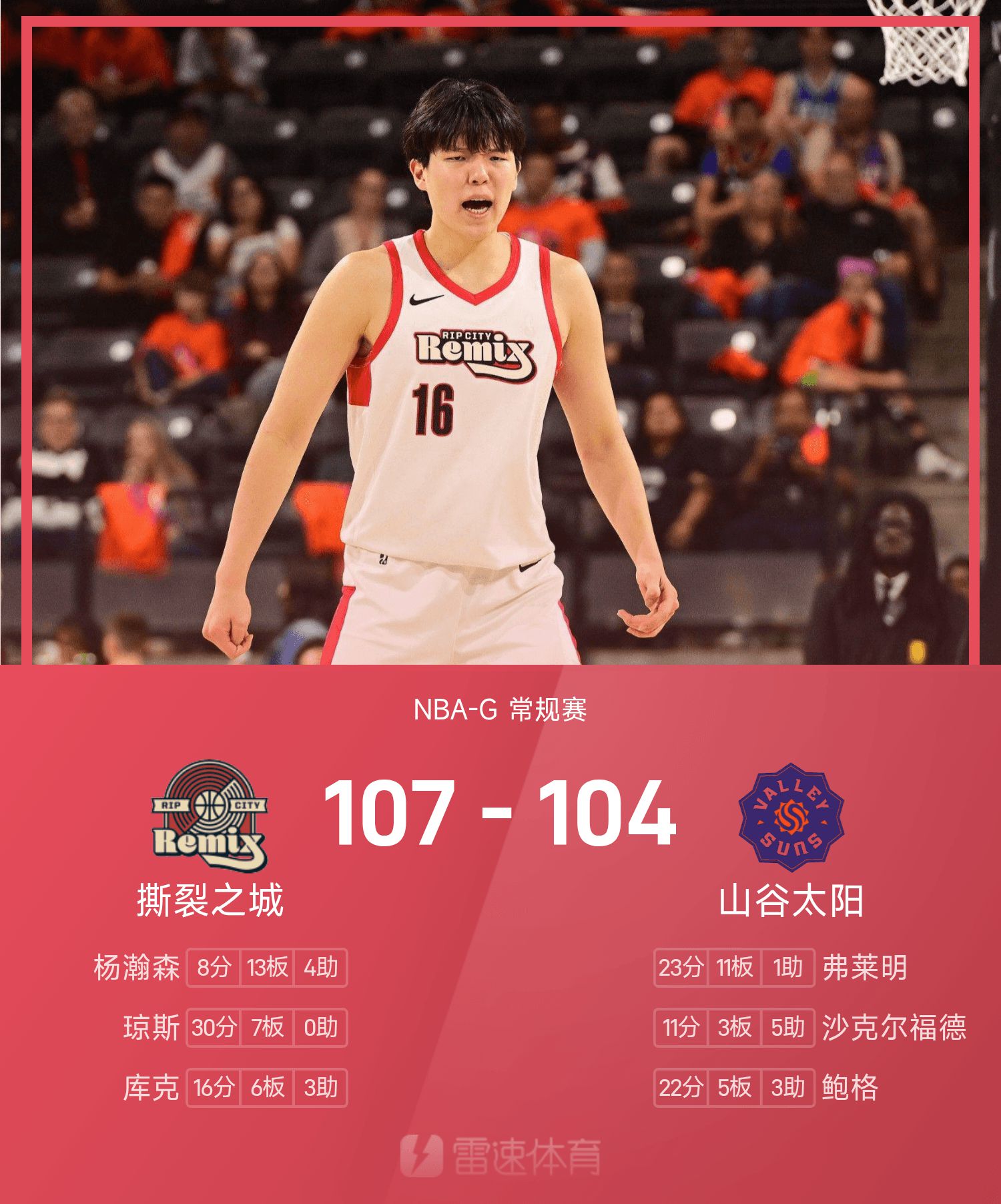 รายงานเกม G League ยาง แฮนเซ่น 8 แต้ม 13 รีบาวด์ ซิตี้ ออฟ เทียร์ เอาชนะ วัลเลย์ ซันส์ 107-104 อย่างหวุดหวิด