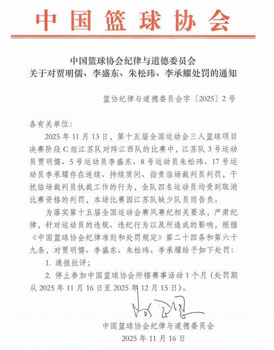6686 ข่าวกีฬา เมื่อวันที่ 16 พฤศจิกายน คณะกรรมการวินัยและจริยธรรมของสมาคมบาสเกตบอลจีนได้ประกาศอย่างเป็นทางการว่า Jia Mingru, Li Shengdong, Zhu Songwei และ Li Chengyao สมาชิกทีมบาสเกตบอลสามคนของ Jiangsu ในการแข่งขันกีฬาแห่งชาติ ถูกลงโทษเนื่องจากการแจ้งคำวิจารณ์และ ระงับการเข้าร่วมกิจกรรมการแข่งขันภายใต้สมาคมบาสเกตบอลจีนเป็นเวลาหนึ่งเดือน เหตุผลก็คือทั้งสี่คนยังคงตั้งคำถามและวิพากษ์วิจารณ์การตัดสินใจของผู้ตัดสิน ณ จุดนั้น และขัดขวางการทำงานของผู้ตัดสิน ณ จุดเกิดเหตุ ข้อความต้นฉบับของประกาศมีดังนี้: