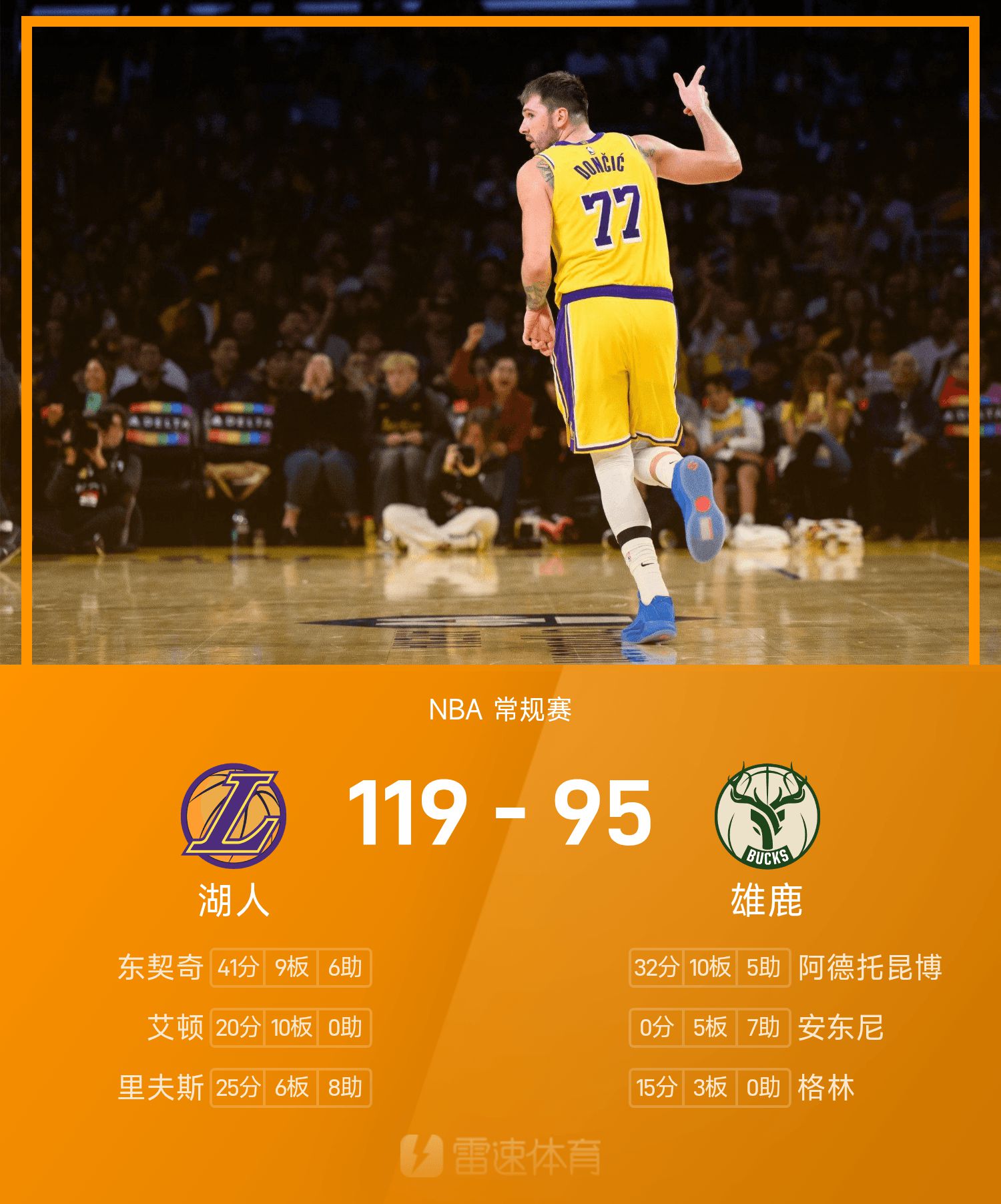 ดอนซิกทำคะแนนสูงสุดในเกม 41 แต้ม 9 รีบาวด์ และ 6 แอสซิสต์ นำทีมเลเกอร์สคว้าชัยชนะ Antetokounmpo ยิง 32+10 อย่างไร้ผล