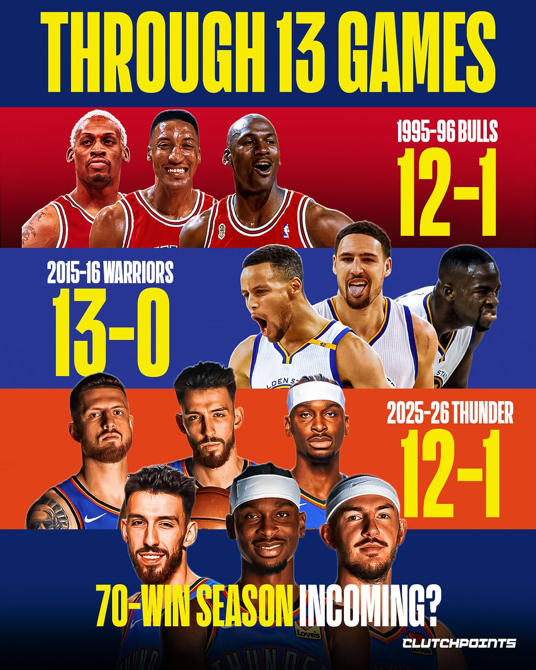 ตอนนี้สถิติของธันเดอร์ใน 13 เกมแรกเทียบได้กับสถิติของบูลส์ในฤดูกาล 1995-96 และคาดว่าพวกเขาจะกลายเป็นทีมถัดไปที่ชนะมากกว่า 70 เกมในหนึ่งฤดูกาล