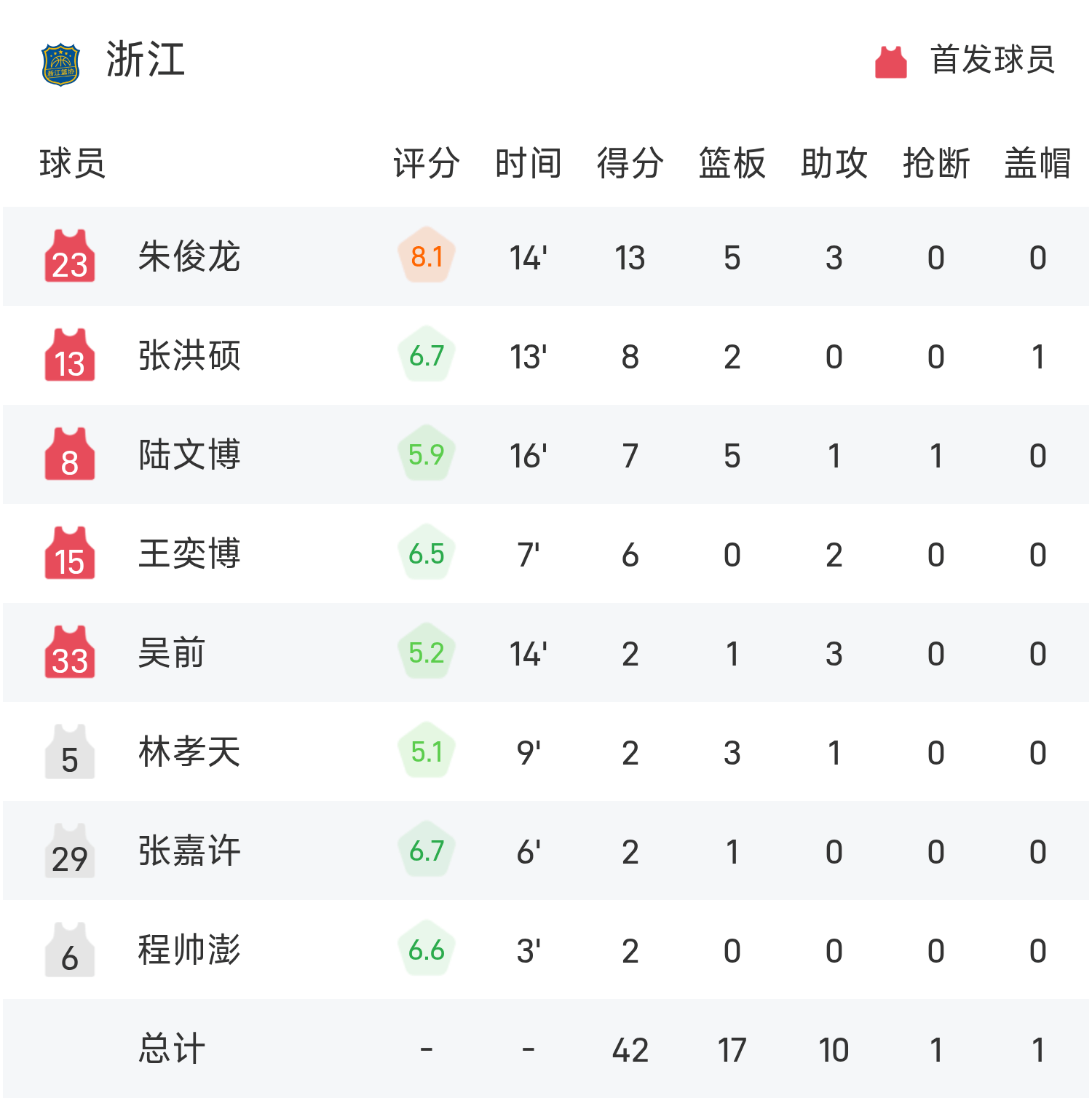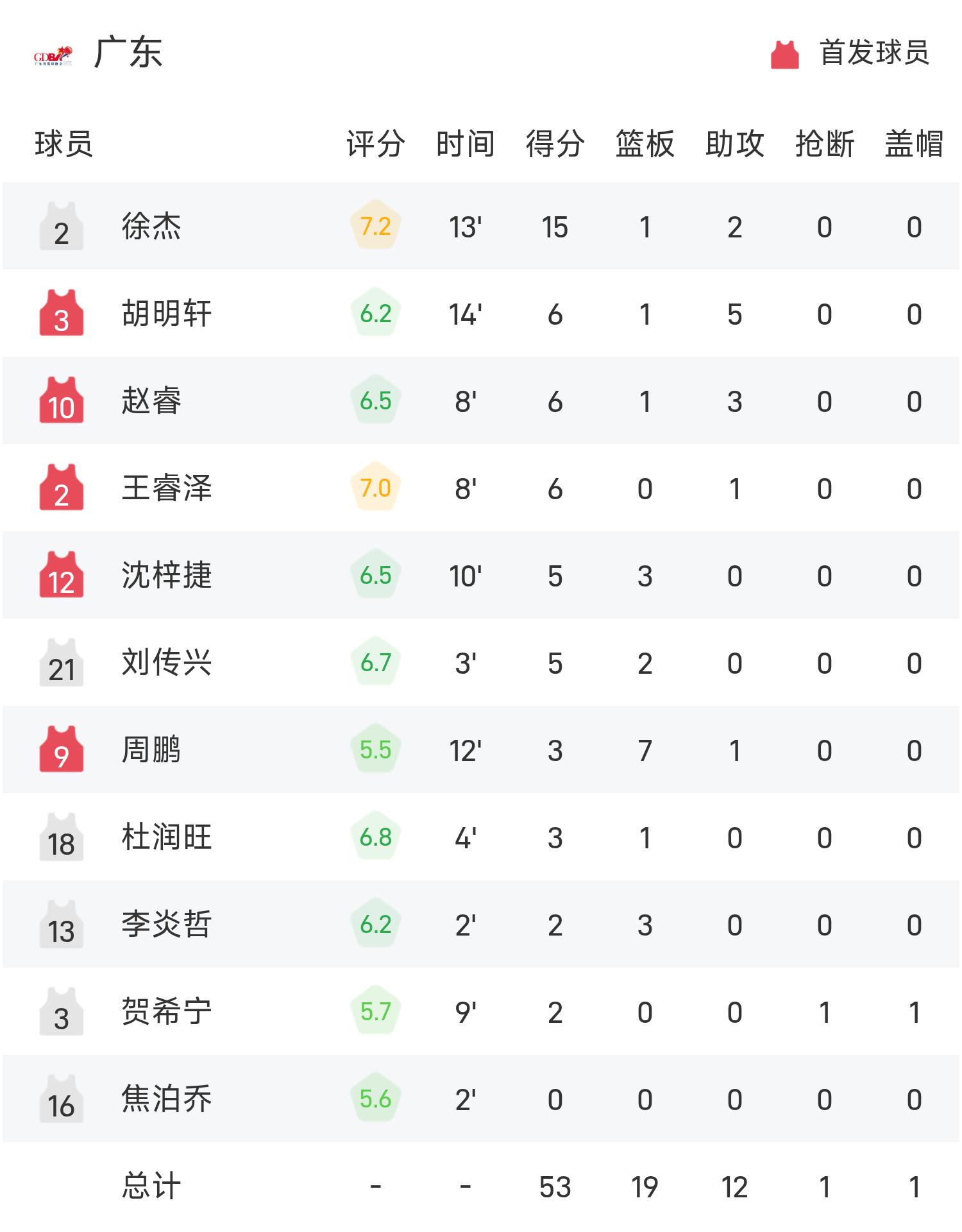 ผู้เล่นสำรองของกวางตุ้ง ซูเจี๋ยทำคะแนน 15 แต้ม 1 รีบาวด์และ 2 แอสซิสต์ ส่วนกองหน้าเจ้อเจียง จูจุนหลงทำคะแนนสูงสุดในทีมได้ 13 แต้ม 5 รีบาวด์และ 3 แอสซิสต์