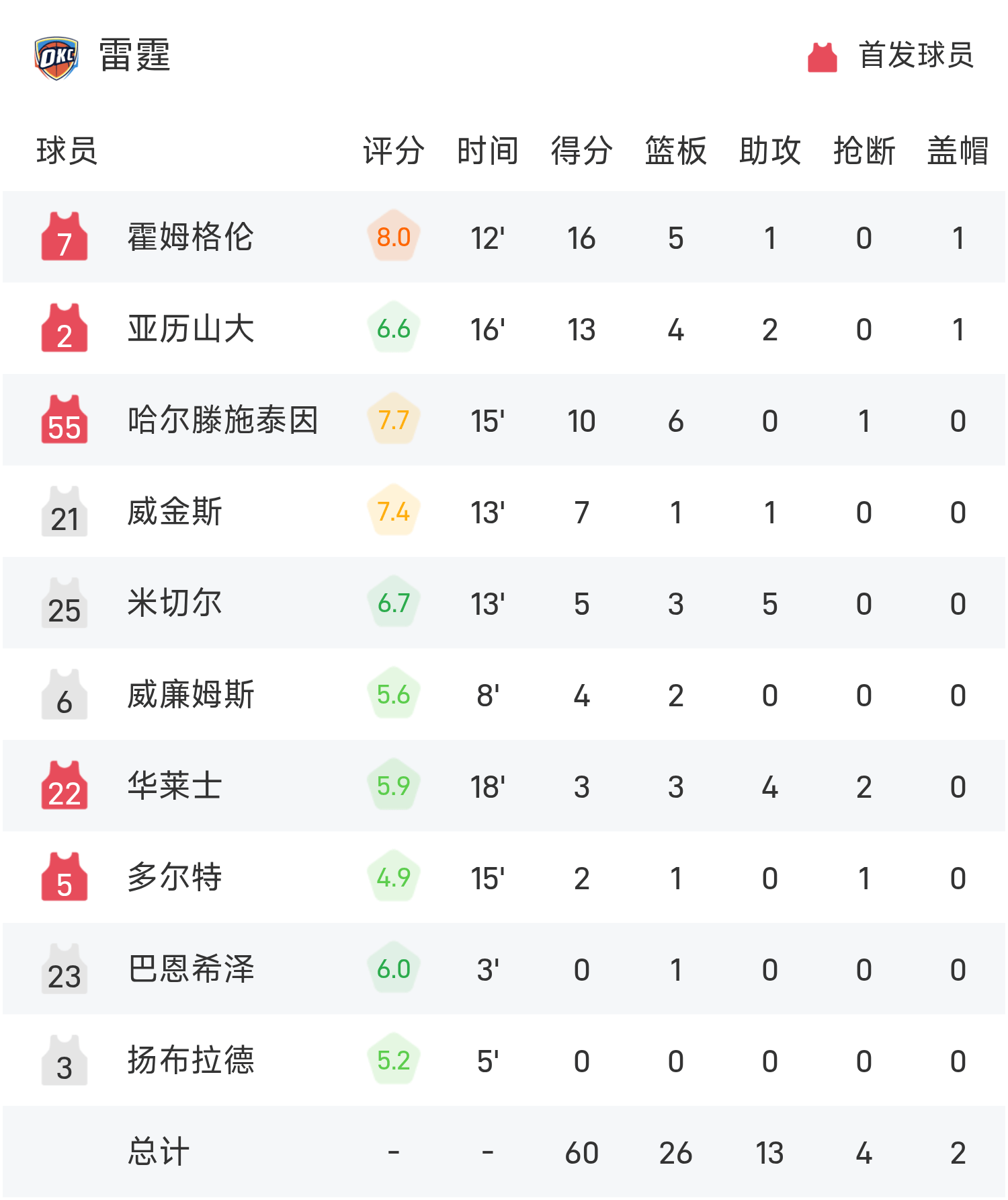 ช่วงพักครึ่ง NBA: โฮล์มเกรน 16 แต้ม, SGA 13 แต้ม 4 รีบาวด์, ธันเดอร์ขึ้นนำ 60-55 เหนือฮอว์กส์
