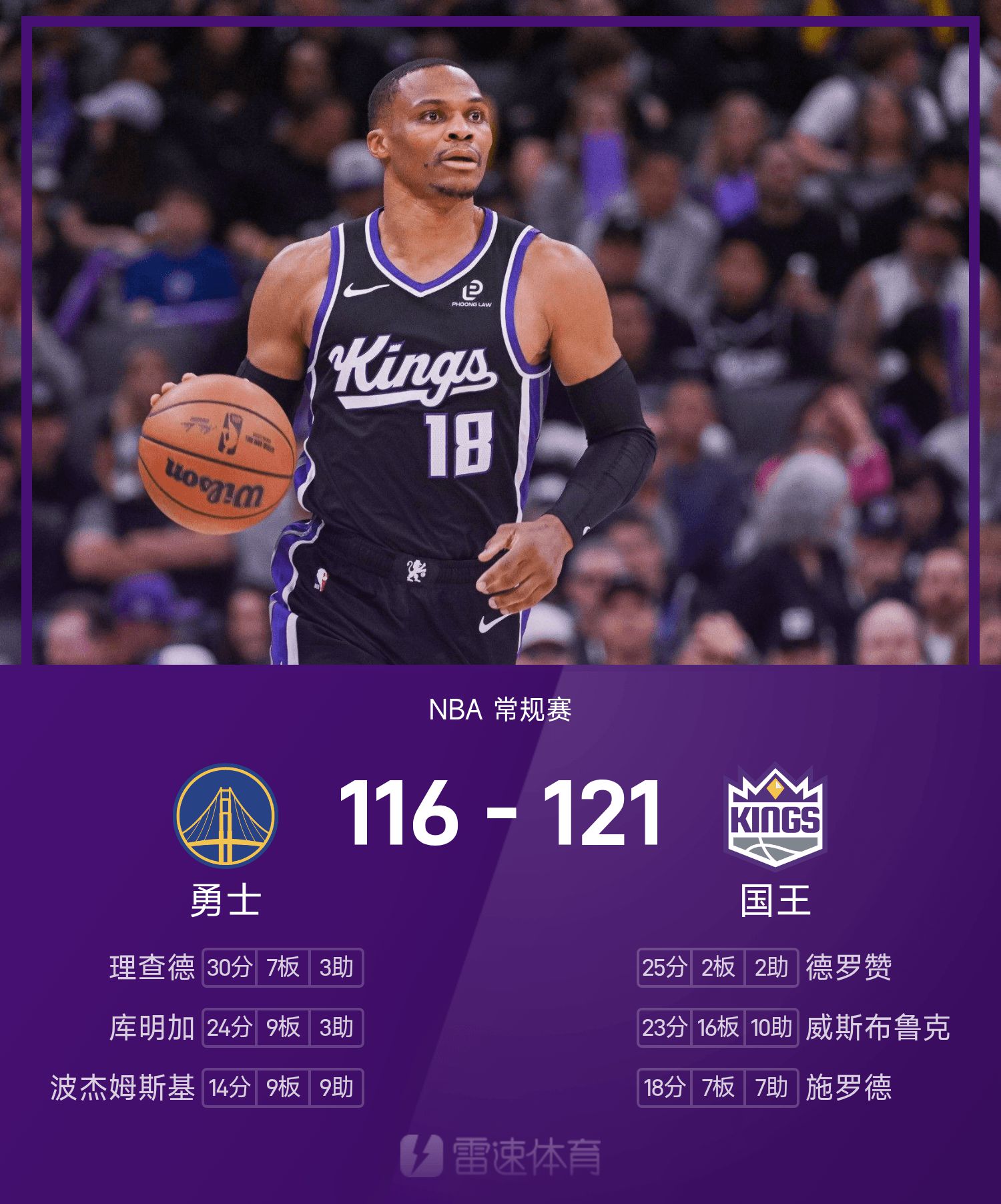 NBA Battle Report: เวสต์บรูค ทริปเปิล-ดับเบิ้ล & สกัดกั้นคีย์ คิงส์ เอาชนะ วอร์ริเออร์ส 121-116