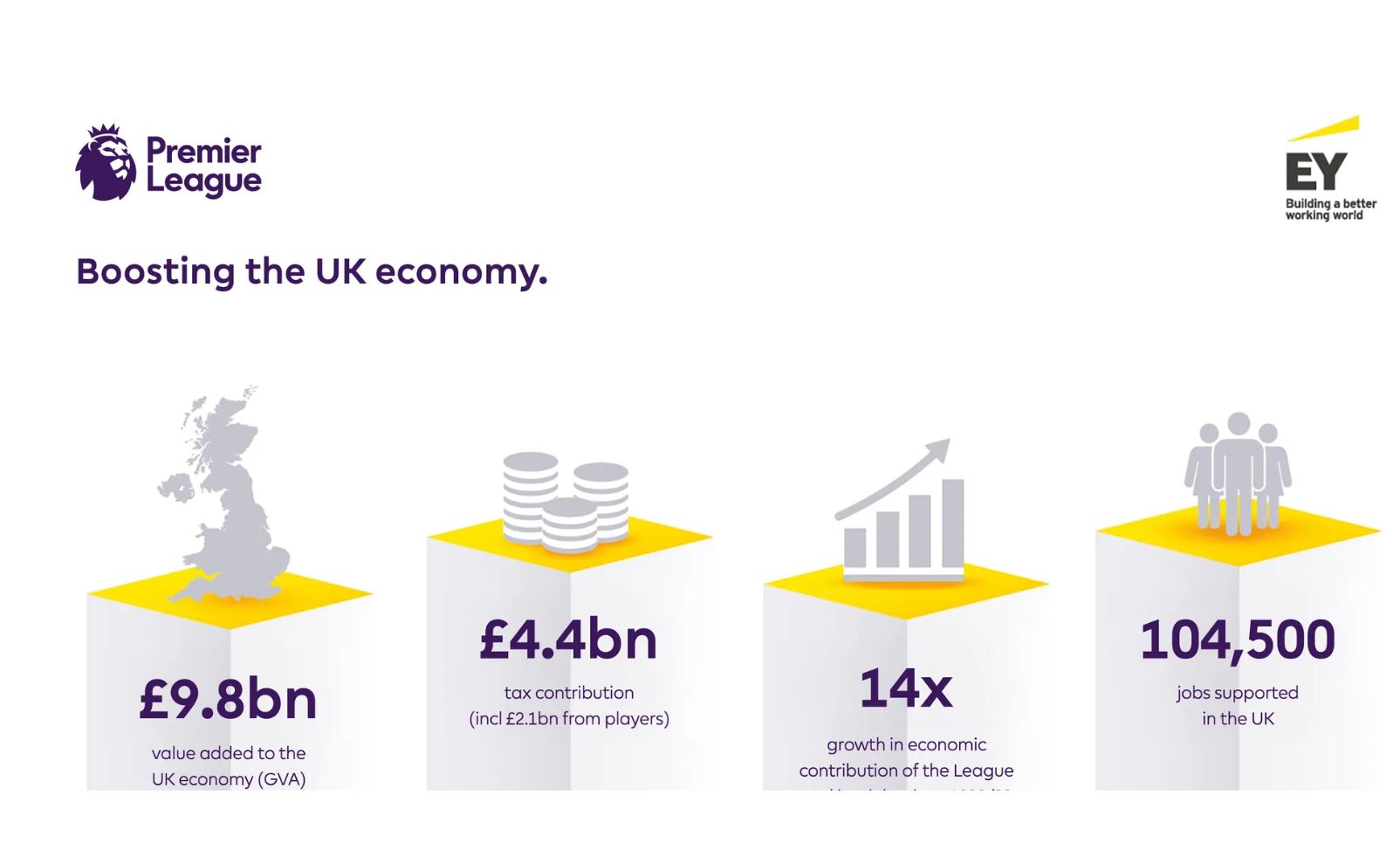 การประเมินโดย Ernst & Young สำหรับฤดูกาล 2023/24 แสดงให้เห็นว่าพรีเมียร์ลีกและสโมสรต่างๆ ได้สร้างมูลค่าเพิ่ม 9.8 พันล้านปอนด์สำหรับเศรษฐกิจของอังกฤษ ซึ่งเพิ่มขึ้น 21% เมื่อเทียบกับฤดูกาล 2021/22 และสูงกว่าฤดูกาล 1998/99 มากกว่า 14 เท่า การวิจัยยังพบว่าการแข่งขันในพรีเมียร์ลีกสนับสนุนงานเต็มเวลามากกว่า 100,000 ตำแหน่งและบริจาคภาษี 4.4 พันล้านปอนด์ รวมถึง 2.1 พันล้านปอนด์จากผู้เล่นและทีมงาน - รายได้ที่ช่วยสนับสนุนบริการสาธารณะทั่วสหราชอาณาจักร