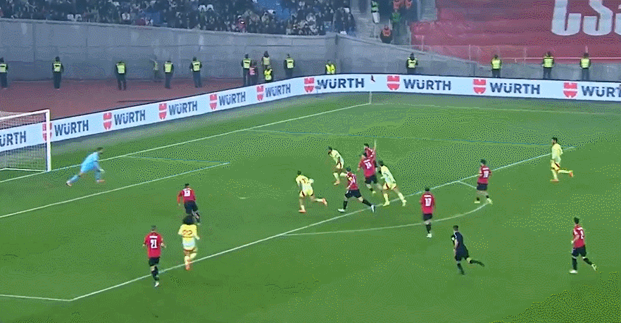 18' บาเอนาผละตัวออกจากการ์ดที่ด้านบนของส่วนโค้งแล้วตีเข้าประตูด้วยเท้าขวา จากนั้นลูกบอลก็ชนเสาและ โผล่ออกมา