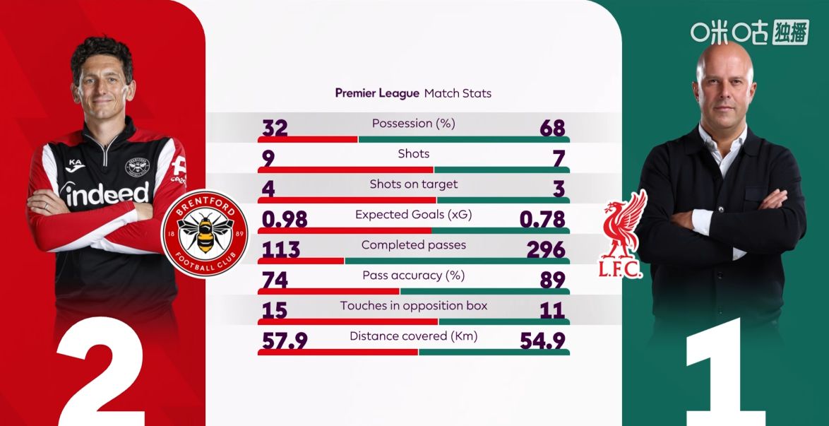 สถิติครึ่งเวลาของลิเวอร์พูล vs เบรนท์ฟอร์ด อัตราการเลี้ยงบอลคือ 73 เจ้าบ้านได้เปรียบในการทำประตู