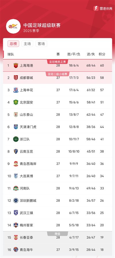 คะแนนเรียลไทม์ของไชนีสซูเปอร์ลีก: ไห่กังนำหน้า 2 แต้ม, เฉิงตูจะขึ้นสู่อันดับต้น ๆ ของรายการหากชนะ, เซินหัวอยู่อันดับสามชั่วคราว