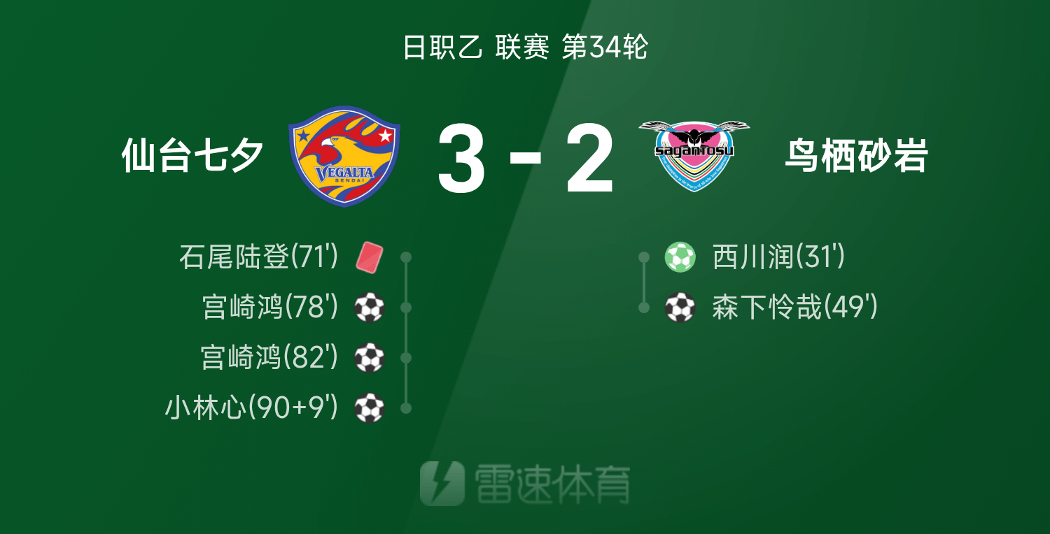 รายงานการแข่งขันลีกบีของญี่ปุ่น โคบายาชิยิงนัดสุดท้ายในช่วงทดเวลาบาดเจ็บ เซนได ทานาบาตะ 10 คนพลิกหินทรายโทสุ 3-2