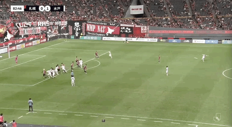 83' คุโบะ เซอิจิโระ โหม่งบอลแล้วชนเสา กรรมการส่งสัญญาณให้เพื่อนร่วมทีมฝ่าฝืนกฎก่อน