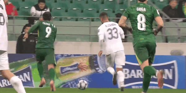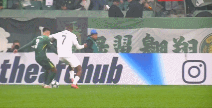 42’ จาง หยุนหนิงรู้สึกอับอายเพราะคู่ต่อสู้ของเขาเลี้ยงลูกอยู่ใต้เป้าของเขา ฟาบิโอผลักคู่ต่อสู้เพื่อเขา เพื่อนร่วมทีม